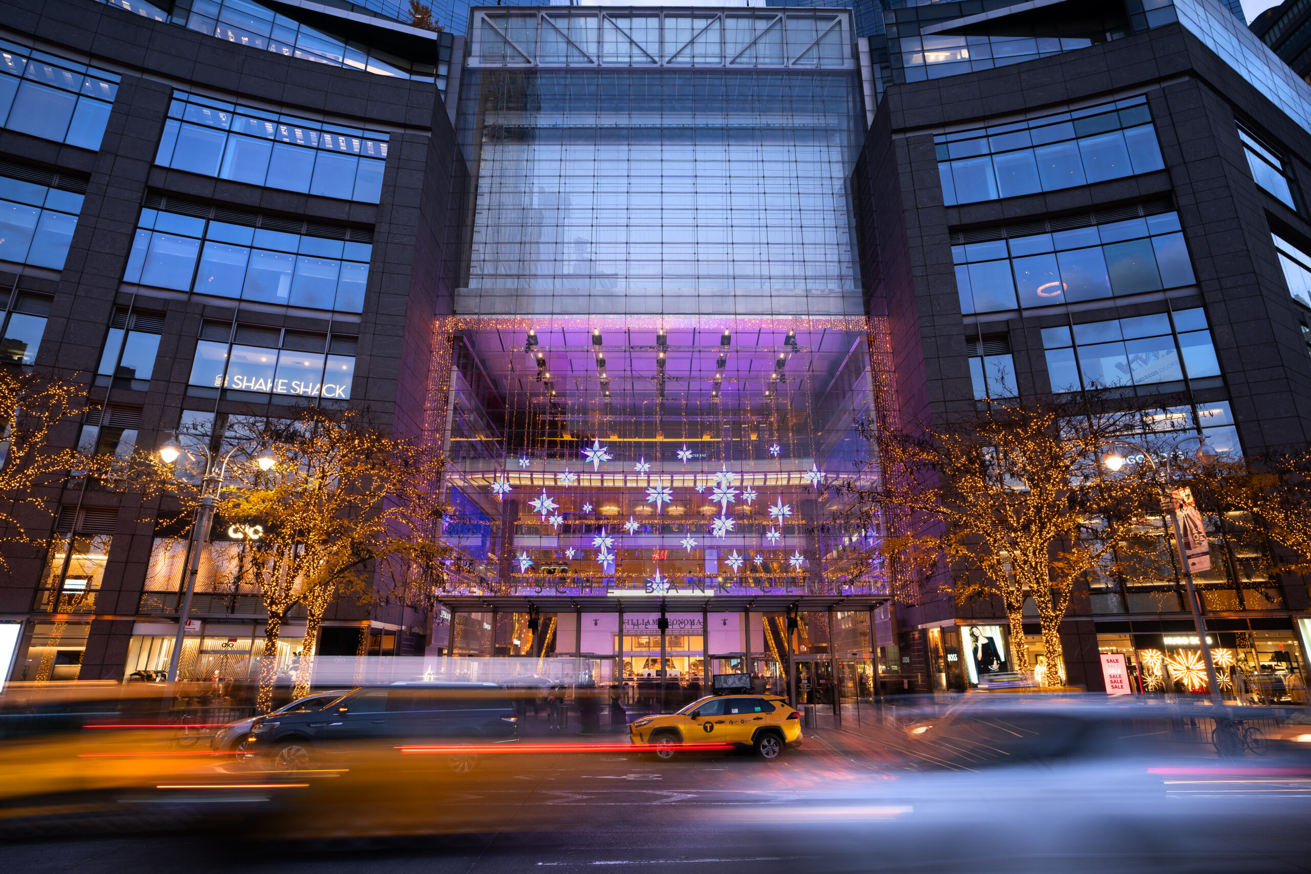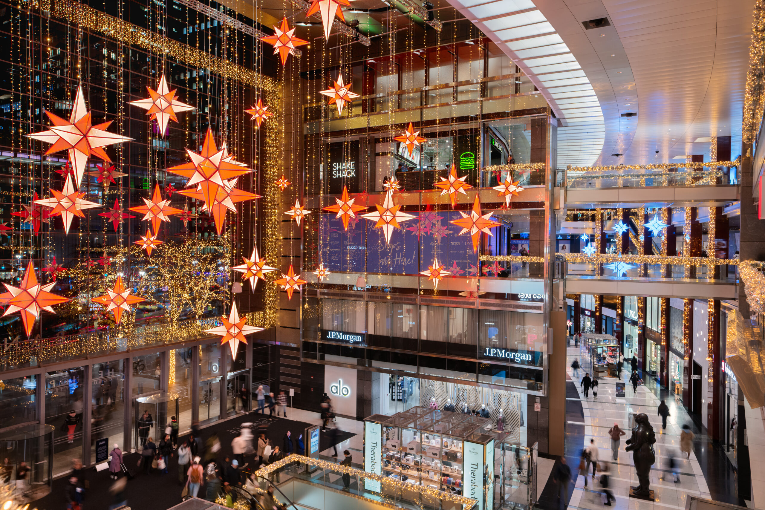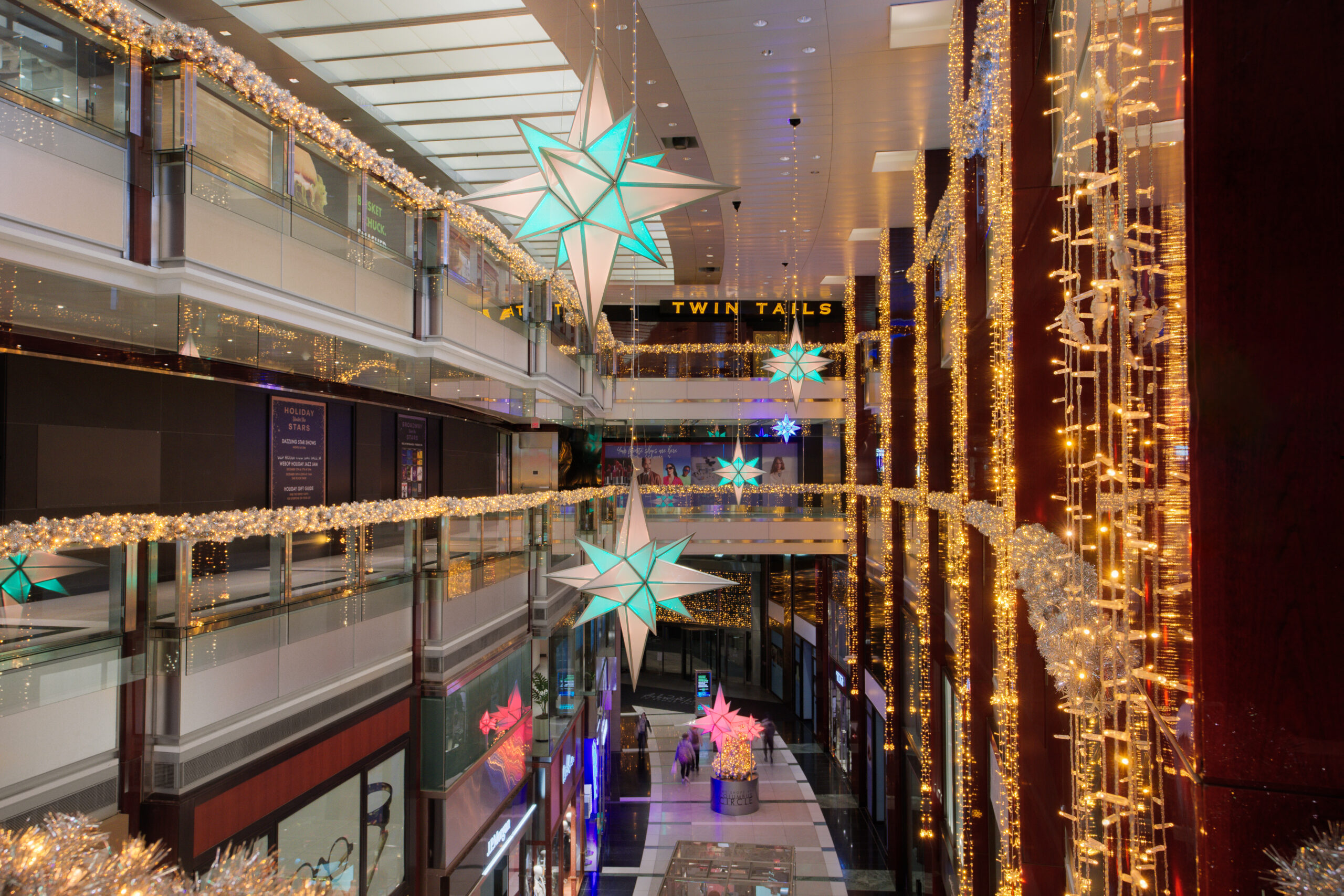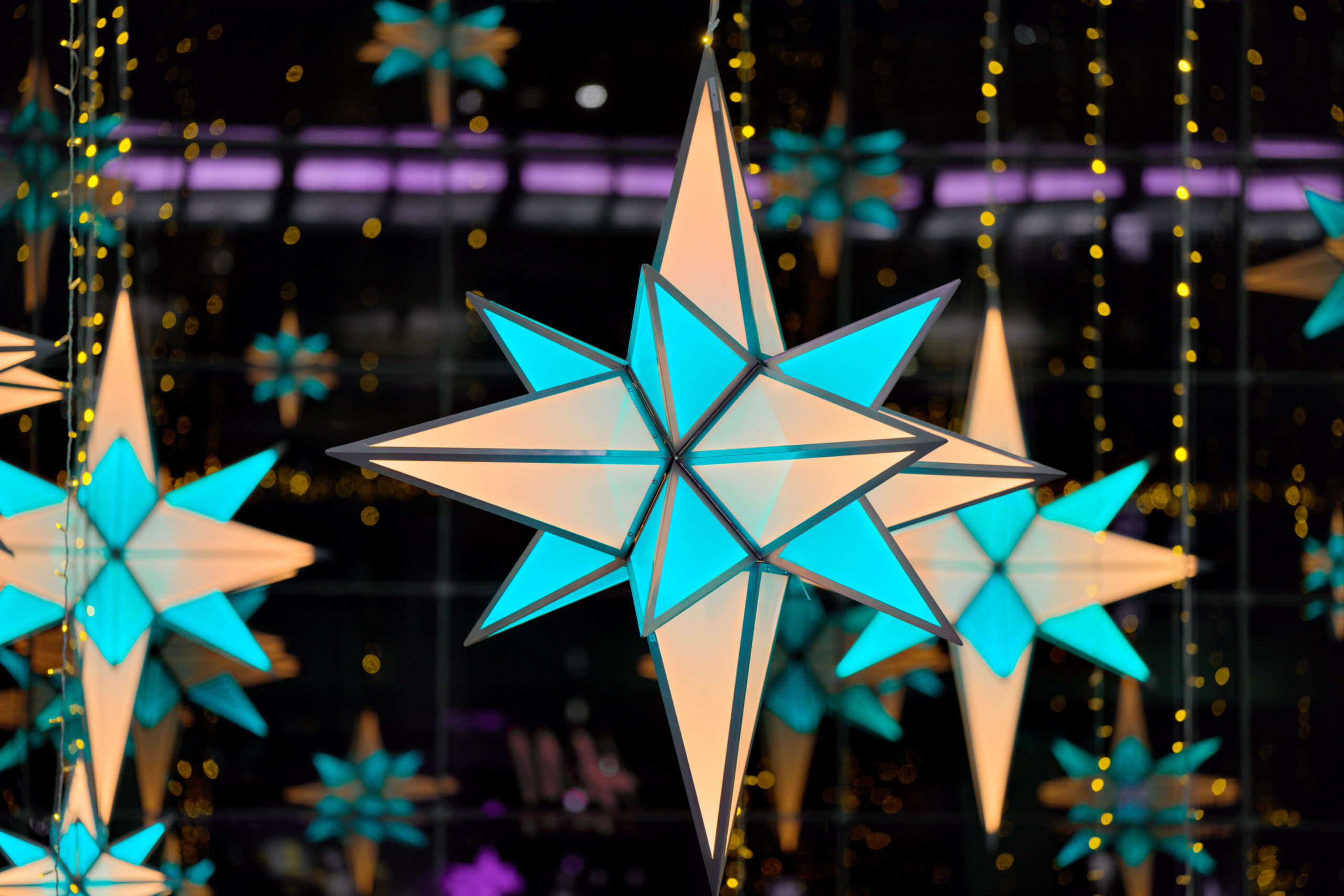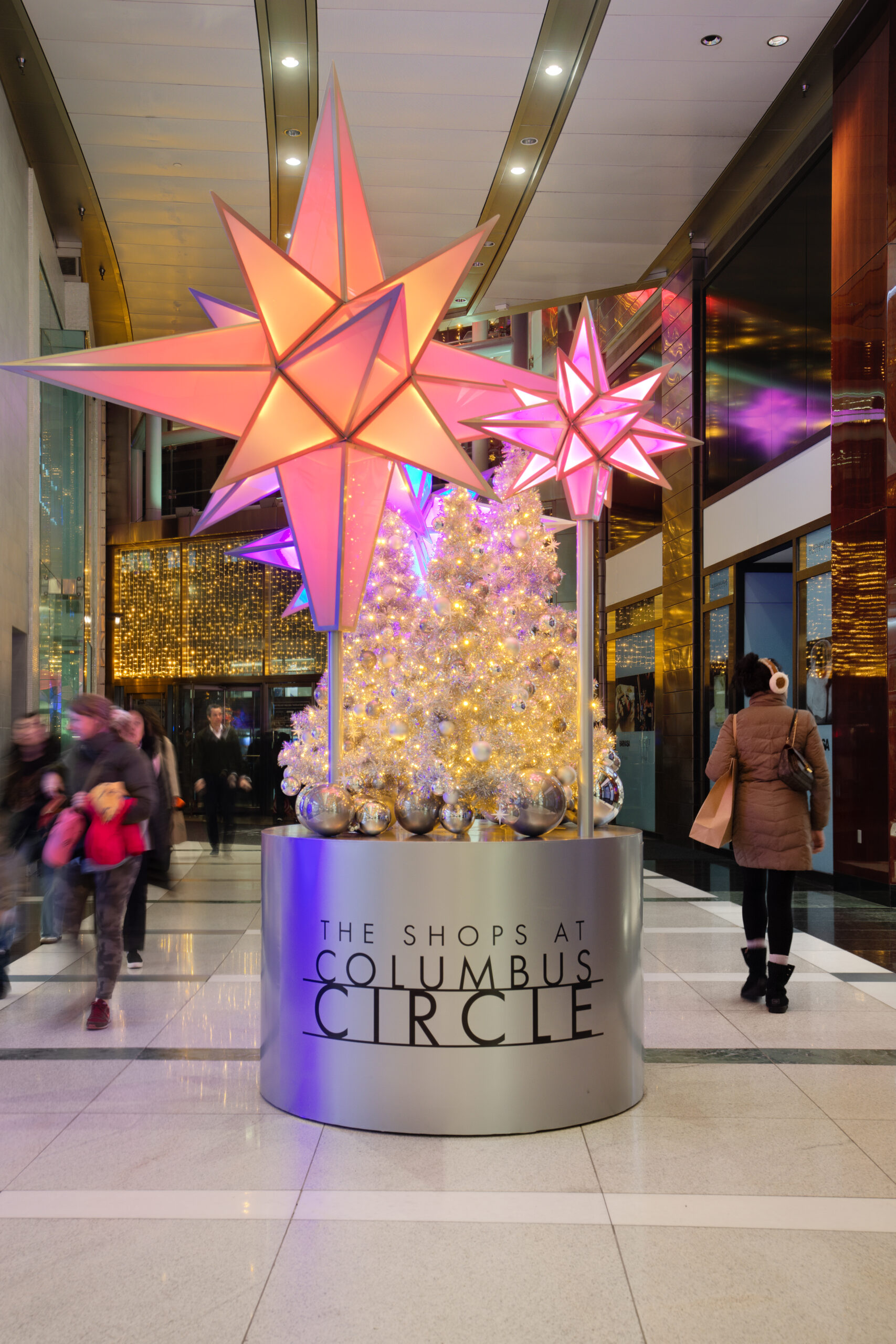 In the heart of The Shops at Columbus Circle shopping centre, a temple of luxury shopping and starred gastronomy located in the heart of Manhattan, New York, we created a majestic ceiling comprising 51 animated RGBWW multi-coloured stars suspended 32 metres high.